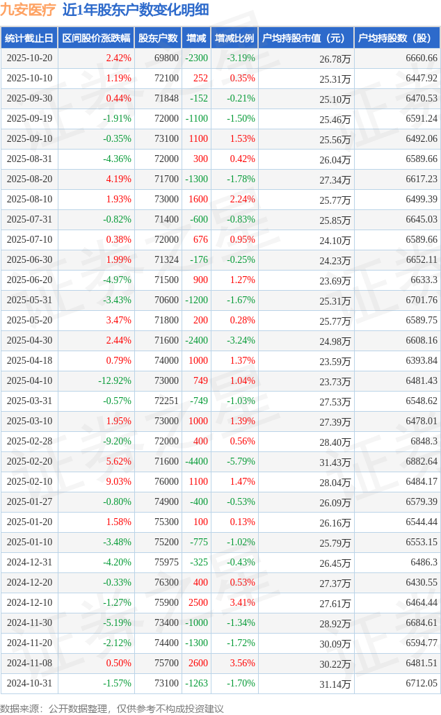 从股价来看,2025年10月10日至2025年10月20日,九安医疗区间涨幅为2.42%,在此期间股东户数减少2300.0户,减幅为3.19%。