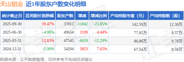 从股价来看,2025年6月30日至2025年9月30日,天山铝业区间涨幅为39.47%,在此期间股东户数减少1.18万户,减幅为23.85%。
