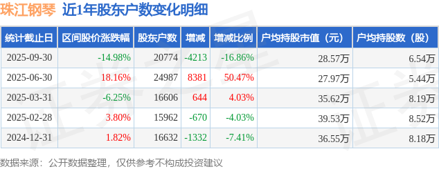 从股价来看,2025年6月30日至2025年9月30日,珠江钢琴区间跌幅为14.98%,在此期间股东户数减少4213.0户,减幅为16.86%。