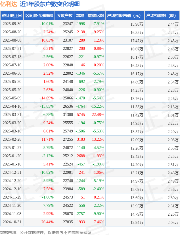 从股价来看,2025年8月20日至2025年9月30日,亿利达区间跌幅为10.01%,在此期间股东户数减少1998.0户,减幅为7.91%。