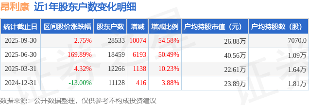 从股价来看,2025年6月30日至2025年9月30日,昂利康区间涨幅为2.75%,在此期间股东户数增加1.01万户,增幅为54.58%。