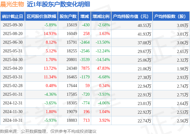 证券之星消息,近日晨光生物披露,截至2025年9月30日公司股东户数为1.56万户,较8月20日减少430.0户,减幅为2.68%。户均持股数量由上期的3.01万股增加至3.09万股,户均持股市值为40.55万元。