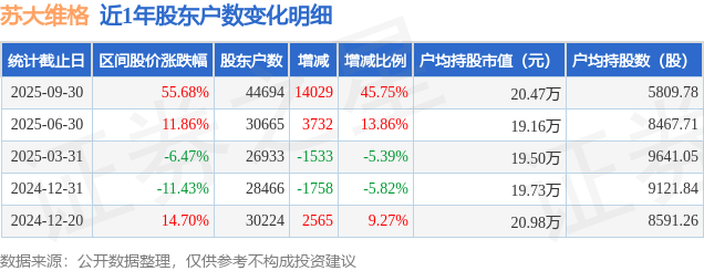 从股价来看,2025年6月30日至2025年9月30日,苏大维格区间涨幅为55.68%,在此期间股东户数增加1.4万户,增幅为45.75%。