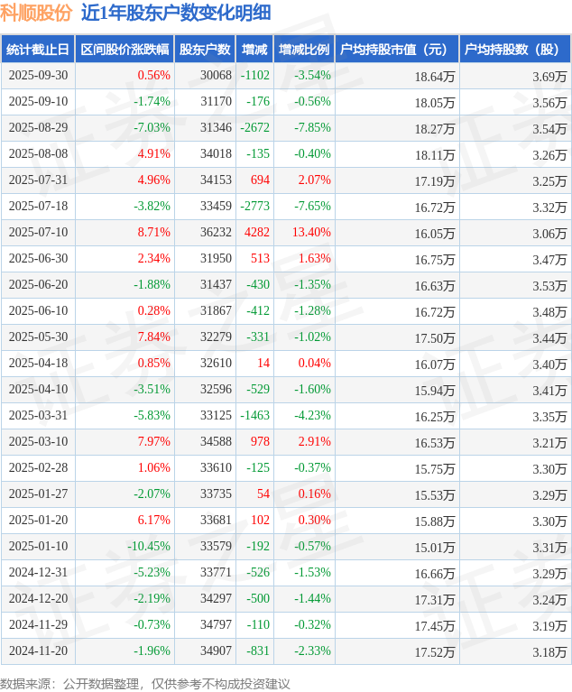 从股价来看,2025年9月10日至2025年9月30日,科顺股份区间涨幅为0.56%,在此期间股东户数减少1102.0户,减幅为3.54%。