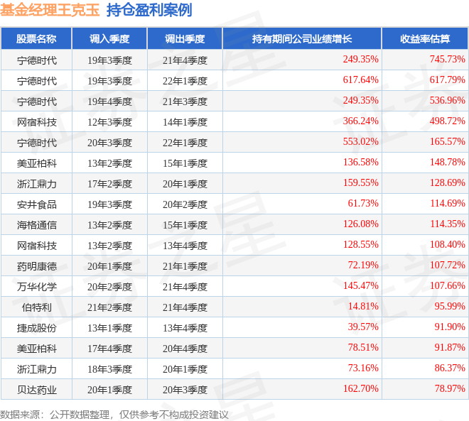 王克玉管理的泓德优选成长混合基金在19年3季度买入宁德时代,在持有2年又1个季度后在21年4季度卖出。持有期间的估算收益率为745.73%,持有期间宁德时代在2019年到2021年的年报归属净利润增幅达249.35%。