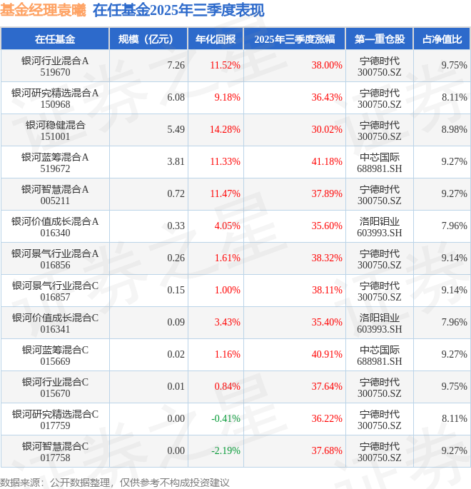 证券之星消息,截止2025年三季度末,基金经理袁曦旗下共管理13只基金,本季度表现最佳的为银河蓝筹混合A(519672),季度净值涨41.18%。
