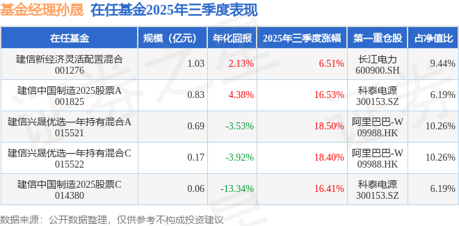 证券之星消息,截止2025年三季度末,基金经理孙晟旗下共管理5只基金,本季度表现最佳的为建信兴晟优选一年持有混合A(015521),季度净值涨18.5%。
