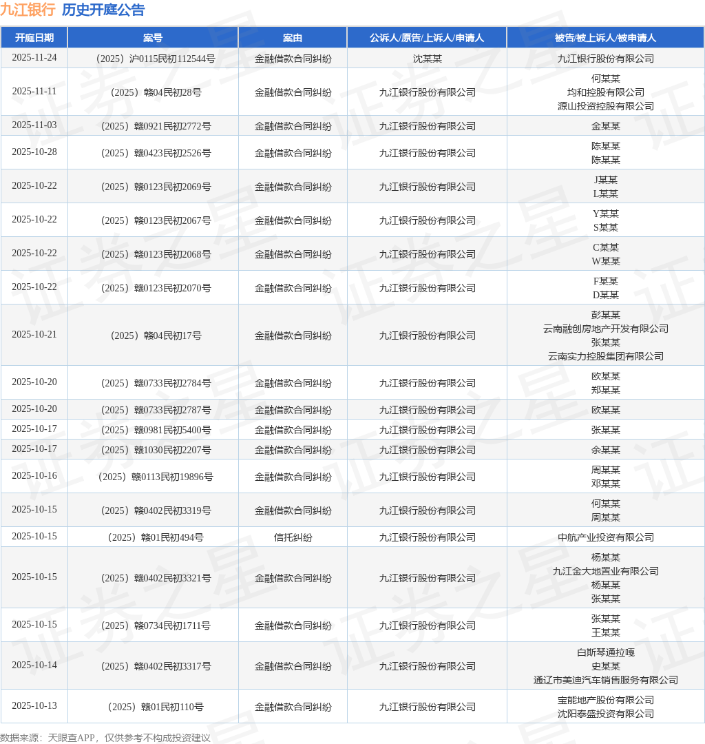 证券之星消息,根据天眼查APP显示,近日公布了一则九江银行股份有限公司作为原告/上诉人的开庭公告,详细内容如下: