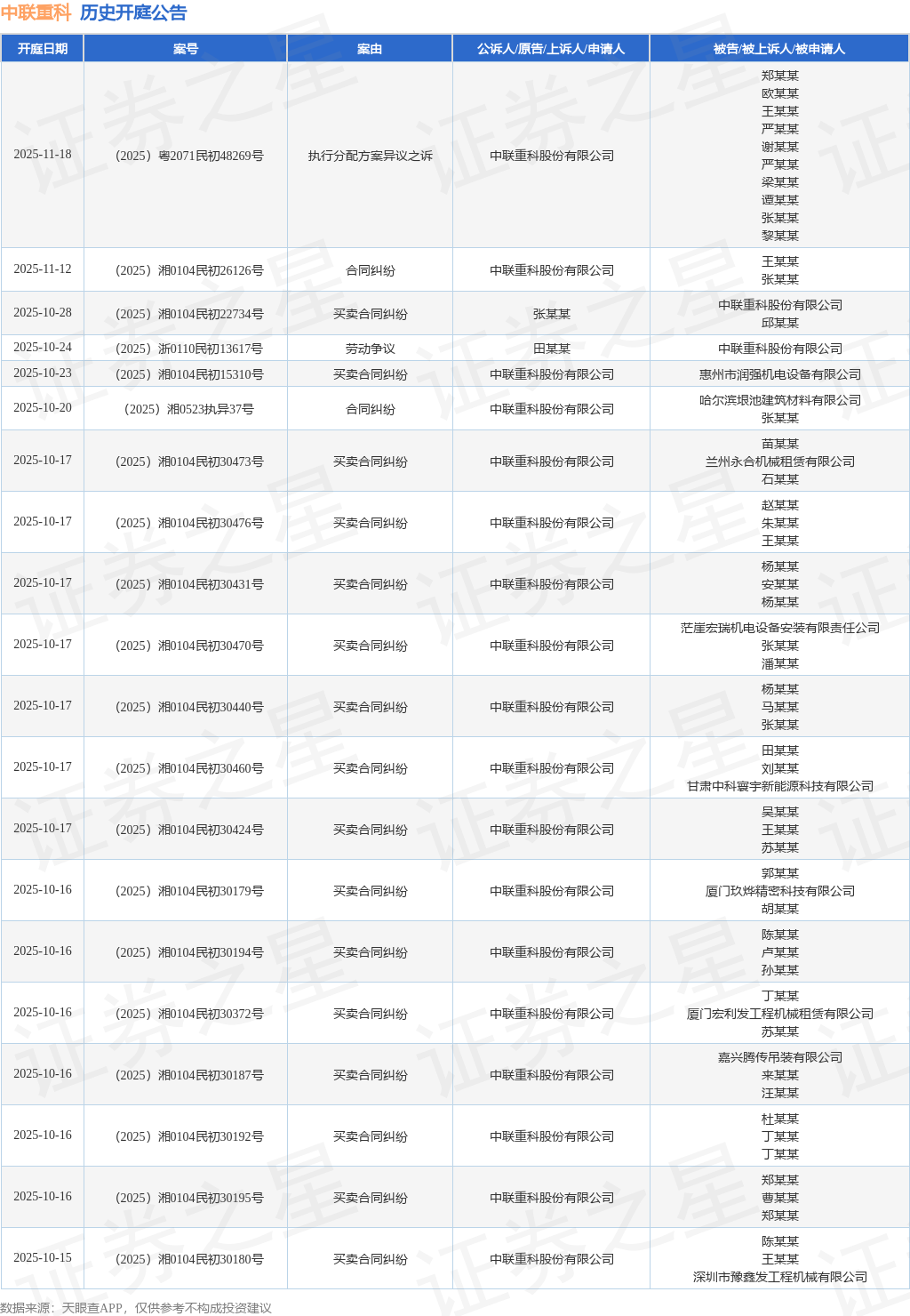 案号:(2025)湘0104民初22734号根据统计,近一年内以中联重科股份有限公司为当事人的历史开庭公告有153则,其中案由为“买卖合同纠纷”的公告以92则居首,其次为“侵权责任纠纷”有8则,“追偿权纠纷”有8则。历史开庭公告(前20条)如下: