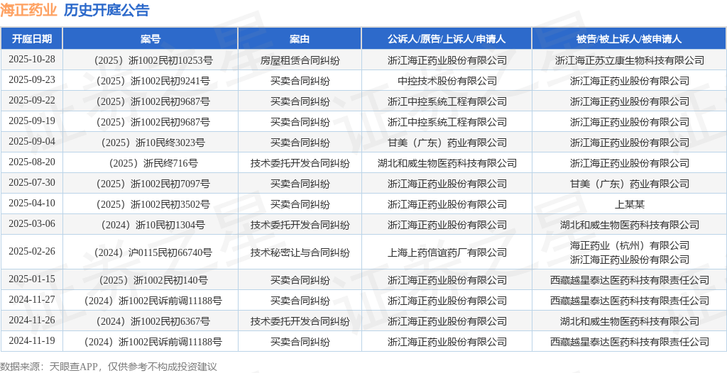 案号:(2025)浙1002民初10253号根据统计,近一年内以浙江海正药业股份有限公司为当事人的历史开庭公告有14则,其中案由为“买卖合同纠纷”的公告以9则居首,其次为“技术委托开发合同纠纷”有3则,“房屋租赁合同纠纷”有1则。历史开庭公告如下: