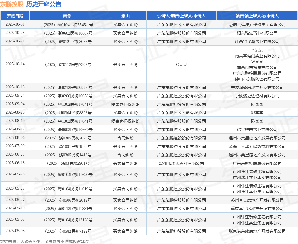 案号:(2025)浙0602民初10667号根据统计,近一年内以广东东鹏控股股份有限公司为当事人的历史开庭公告有81则,其中案由为“买卖合同纠纷”的公告以66则居首,其次为“合同纠纷”有6则,“侵害商标权纠纷”有5则。历史开庭公告(前20条)如下: