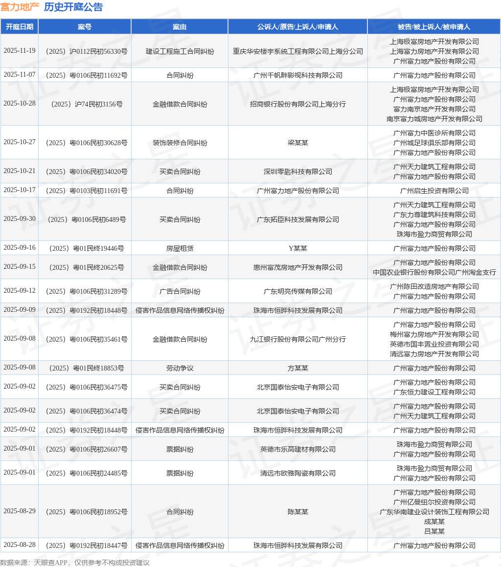 案号:(2025)沪74民初3156号根据统计,近一年内以广州富力地产股份有限公司为当事人的历史开庭公告有272则,其中案由为“买卖合同纠纷”的公告以62则居首,其次为“票据纠纷”有29则,“广告合同纠纷”有28则。历史开庭公告(前20条)如下: