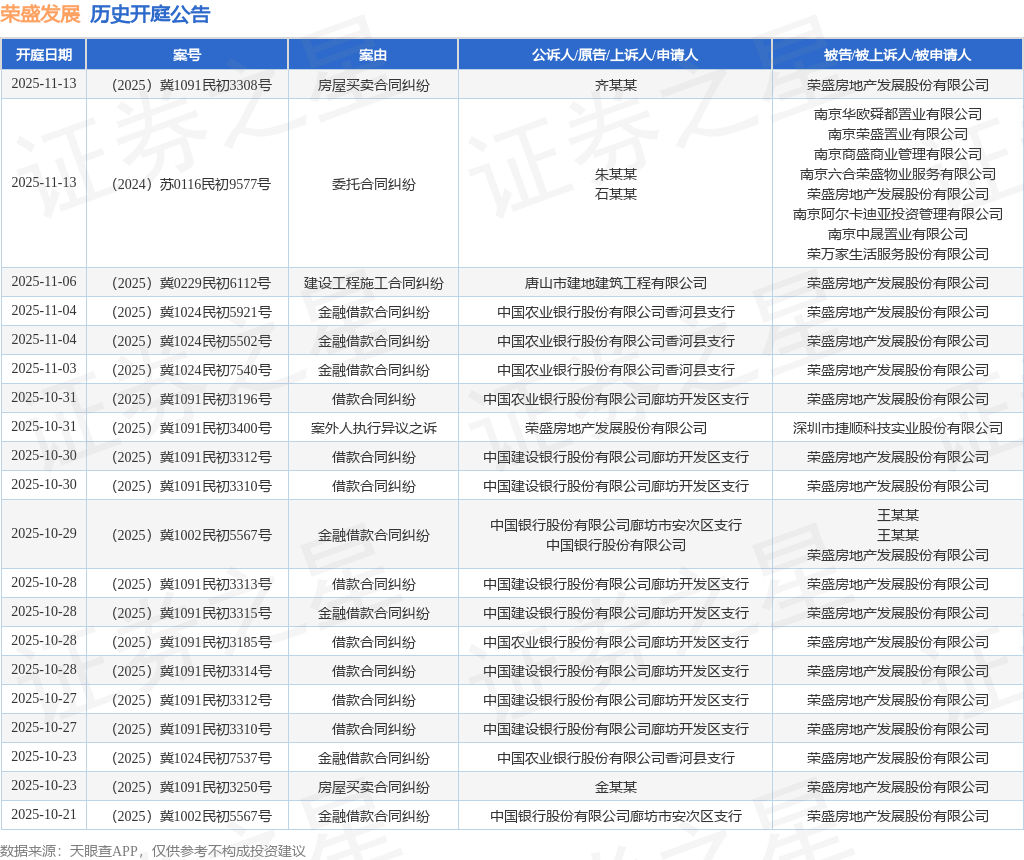 案号:(2025)冀1091民初3315号根据统计,近一年内以荣盛房地产发展股份有限公司为当事人的历史开庭公告有432则,其中案由为“借款合同纠纷”的公告以84则居首,其次为“票据追索权纠纷”有82则,“房屋买卖合同纠纷”有72则。历史开庭公告(前20条)如下: