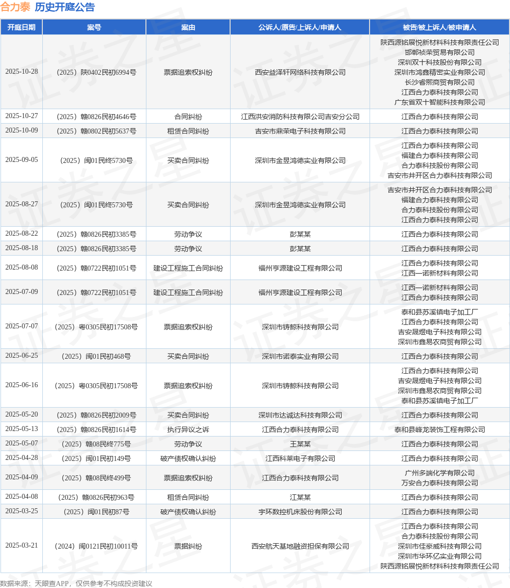 案号:(2025)陕0402民初6994号根据统计,近一年内以江西合力泰科技有限公司为当事人的历史开庭公告有77则,其中案由为“票据追索权纠纷”的公告以32则居首,其次为“建设工程施工合同纠纷”有13则,“买卖合同纠纷”有11则。历史开庭公告(前20条)如下:
