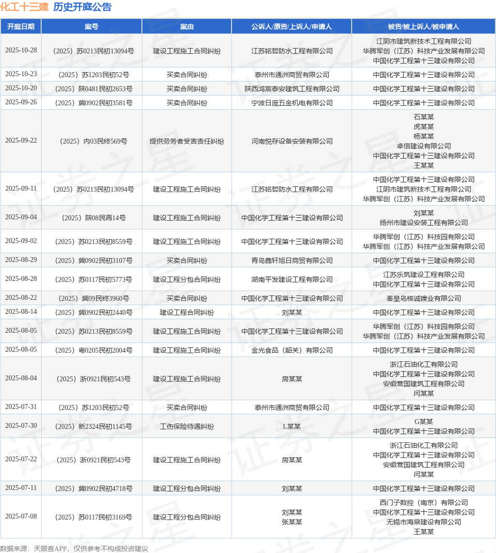 案号:(2025)苏0213民初13094号根据统计,近一年内以中国化学工程第十三建设有限公司为当事人的历史开庭公告有73则,其中案由为“建设工程施工合同纠纷”的公告以22则居首,其次为“建设工程分包合同纠纷”有11则,“买卖合同纠纷”有8则。历史开庭公告(前20条)如下: