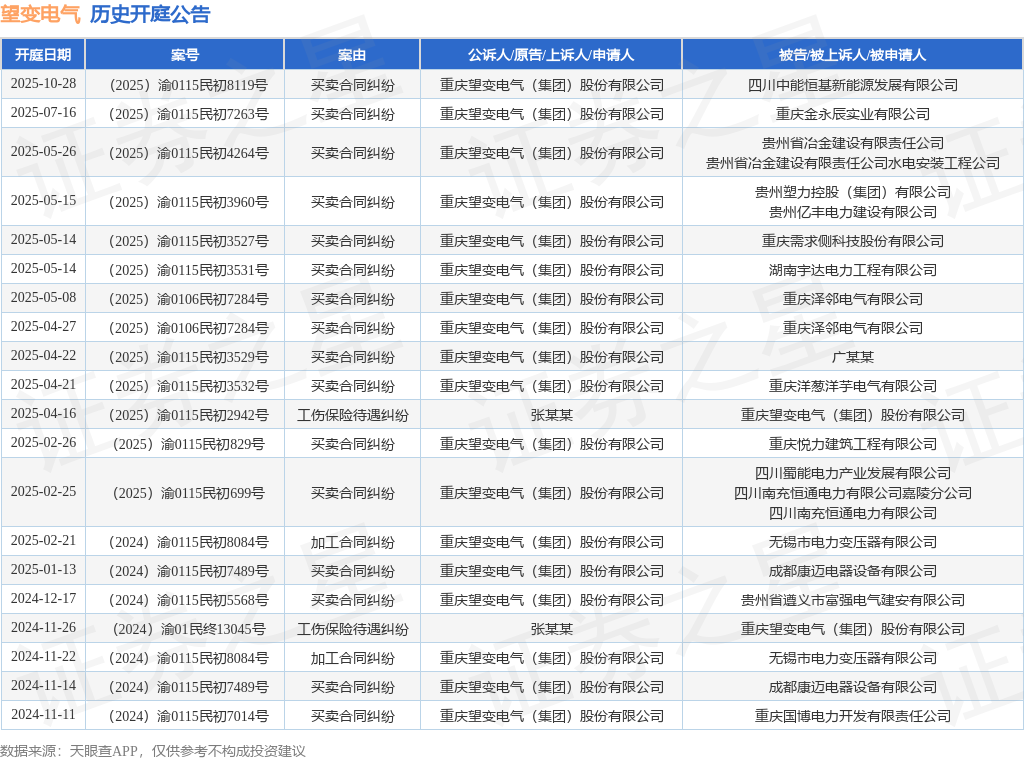 案号:(2025)渝0115民初8119号根据统计,近一年内以重庆望变电气(集团)股份有限公司为当事人的历史开庭公告有23则,其中案由为“买卖合同纠纷”的公告以18则居首,其次为“加工合同纠纷”有2则,“工伤保险待遇纠纷”有2则。历史开庭公告(前20条)如下: