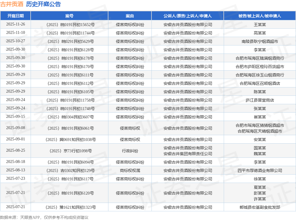 案号:(2025)皖0291民初5629号根据统计,近一年内以安徽古井贡酒股份有限公司为当事人的历史开庭公告有81则,其中案由为“侵害商标权纠纷”的公告以59则居首,其次为“不正当竞争纠纷”有7则,“行政纠纷”有7则。历史开庭公告(前20条)如下: