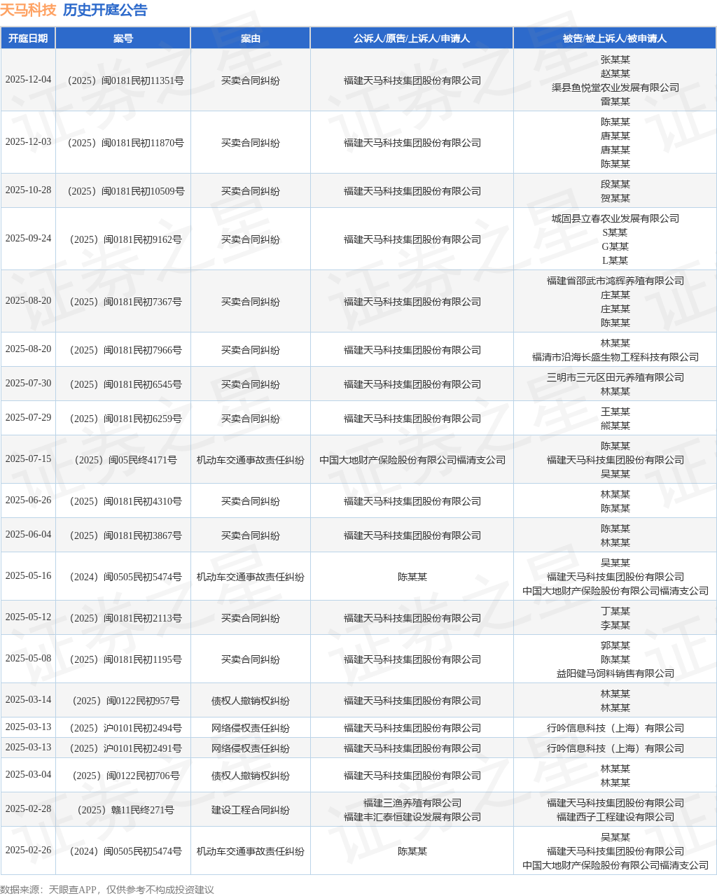 案号:(2025)闽0181民初10509号根据统计,近一年内以福建天马科技集团股份有限公司为当事人的历史开庭公告有23则,其中案由为“买卖合同纠纷”的公告以13则居首,其次为“机动车交通事故责任纠纷”有4则,“债权人撤销权纠纷”有2则。历史开庭公告(前20条)如下: