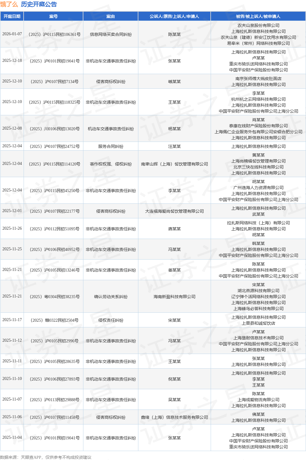 案号:(2025)浙0110民初10966号根据统计,近一年内以上海拉扎斯信息科技有限公司为当事人的历史开庭公告有430则,其中案由为“非机动车交通事故责任纠纷”的公告以245则居首,其次为“侵害商标权纠纷”有49则,“机动车交通事故责任纠纷”有48则。历史开庭公告(前20条)如下: