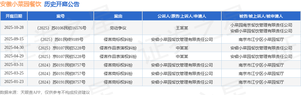 案号:(2025)苏0106民初16576号根据统计,近一年内以安徽小菜园餐饮管理有限责任公司为当事人的历史开庭公告有7则,其中案由为“侵害商标权纠纷”的公告以4则居首,其次为“侵害作品表演权纠纷”有2则,“劳动争议”有1则。历史开庭公告如下: