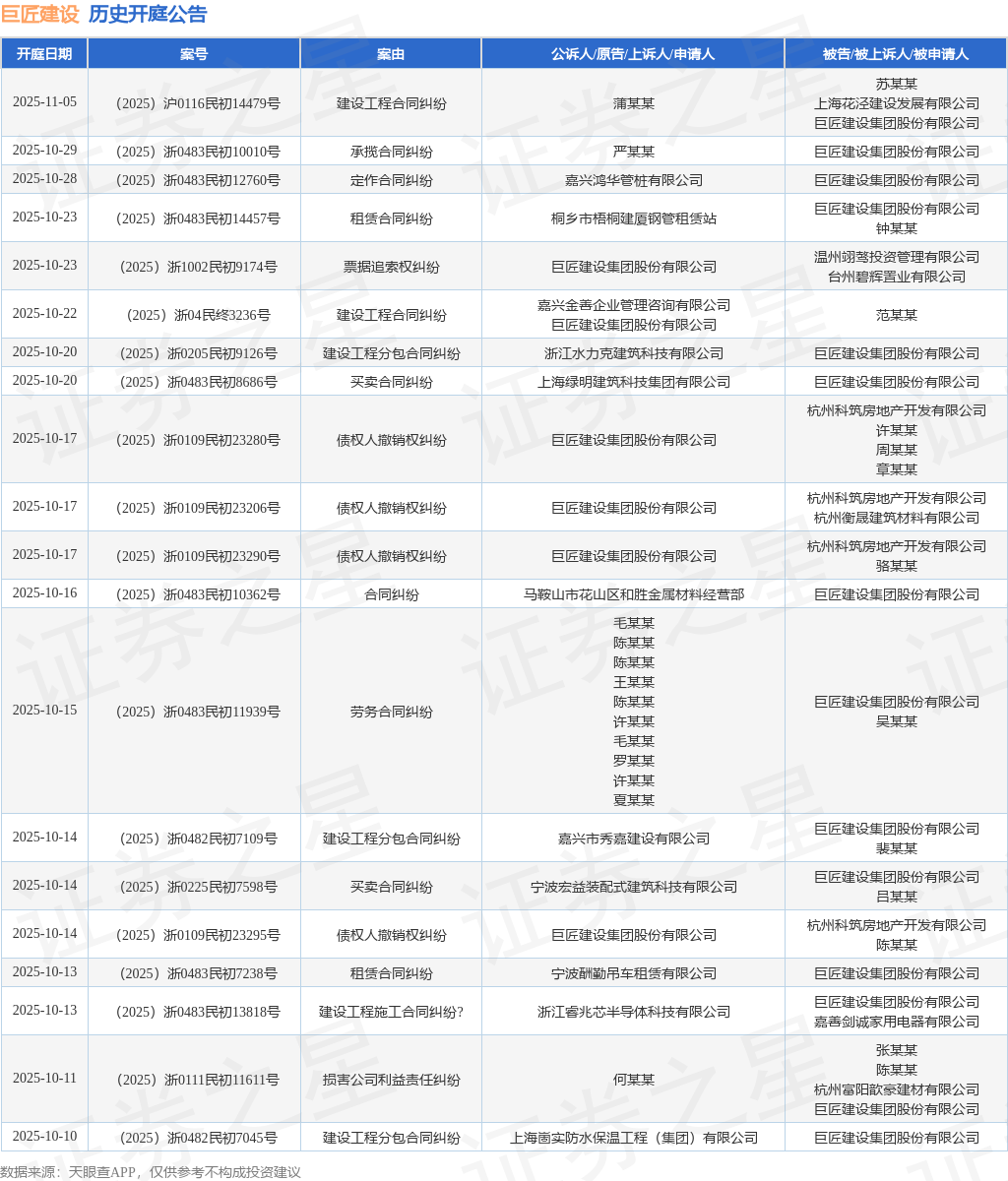 案号:(2025)浙0483民初12760号根据统计,近一年内以巨匠建设集团股份有限公司为当事人的历史开庭公告有230则,其中案由为“买卖合同纠纷”的公告以74则居首,其次为“合同纠纷”有34则,“建设工程施工合同纠纷”有31则。历史开庭公告(前20条)如下: