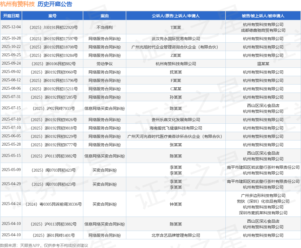 案号:(2025)浙0192民初17597号根据统计,近一年内以杭州有赞科技有限公司为当事人的历史开庭公告有32则,其中案由为“网络服务合同纠纷”的公告以22则居首,其次为“买卖合同纠纷”有3则,“信息网络买卖合同纠纷”有3则。历史开庭公告(前20条)如下: