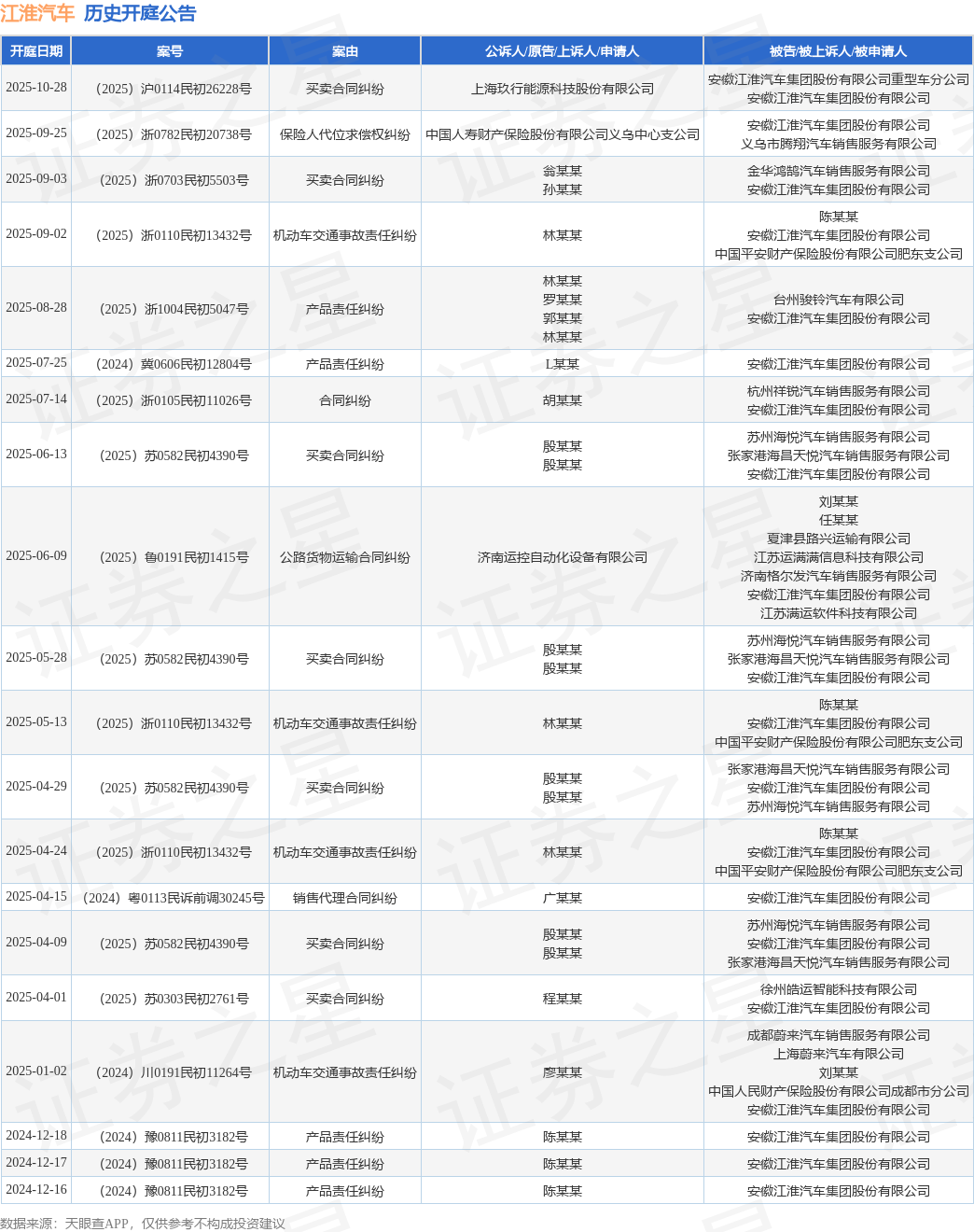 案号:(2025)沪0114民初26228号根据统计,近一年内以安徽江淮汽车集团股份有限公司为当事人的历史开庭公告有24则,其中案由为“买卖合同纠纷”的公告以8则居首,其次为“产品责任纠纷”有7则,“机动车交通事故责任纠纷”有4则。历史开庭公告(前20条)如下: