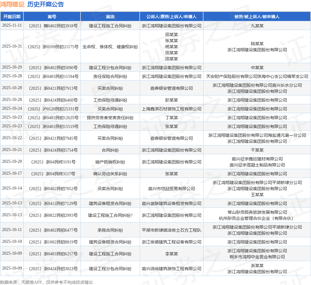 案号:(2025)浙0481民初11594号根据统计,近一年内以浙江鸿翔建设集团股份有限公司为当事人的历史开庭公告有197则,其中案由为“建设工程施工合同纠纷”的公告以40则居首,其次为“买卖合同纠纷”有31则,“建设工程分包合同纠纷”有26则。历史开庭公告(前20条)如下: