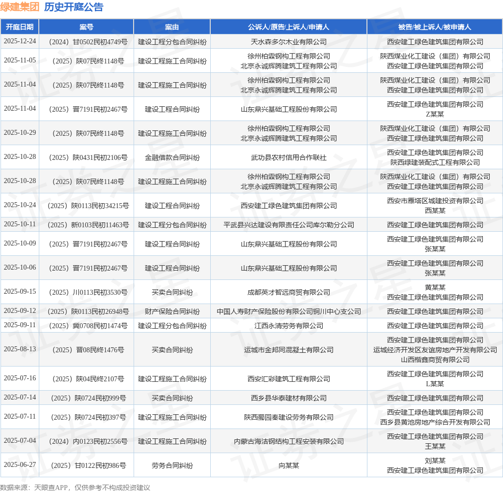 案号:(2025)陕07民终1148号根据统计,近一年内以西安建工绿色建筑集团有限公司为当事人的历史开庭公告有99则,其中案由为“建设工程施工合同纠纷”的公告以24则居首,其次为“买卖合同纠纷”有23则,“劳务合同纠纷”有14则。历史开庭公告(前20条)如下: