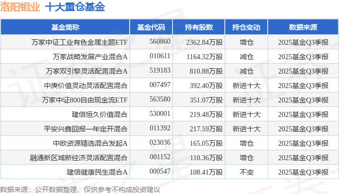 持有洛阳钼业最多的基金为万家中证工业有色金属主题ETF,目前规模为36.1亿元,最新净值1.4079(10月24日),较上一交易日上涨2.26%,近一年上涨8.75%。该基金现任基金经理为贺方舟。