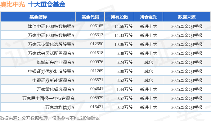 持有奥比中光最多的基金为建信中证1000指数增强A,目前规模为7.4亿元,最新净值2.0087(10月24日),较上一交易日上涨1.47%,近一年上涨39.84%。该基金现任基金经理为叶乐天 赵云煜。