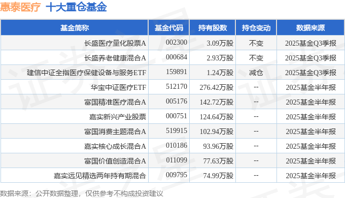 持有惠泰医疗最多的基金为长盛医疗量化股票A,目前规模为1.32亿元,最新净值2.1792(10月24日),较上一交易日上涨0.27%,近一年上涨19.01%。该基金现任基金经理为郝征。
