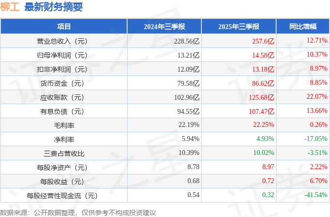 据证券之星公开数据整理,近期柳工(000528)发布2025年三季报。截至本报告期末,公司营业总收入257.6亿元,同比上升12.71%,归母净利润14.58亿元,同比上升10.37%。按单季度数据看,第三季度营业总收入75.79亿元,同比上升11.52%,第三季度归母净利润2.28亿元,同比下降32.47%。本报告期柳工公司应收账款体量较大,当期应收账款占最新年报归母净利润比达947.04%。