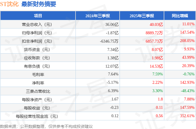 据证券之星公开数据整理,近期ST沈化(000698)发布2025年三季报。根据财报显示,ST沈化营收净利润同比双双增长。截至本报告期末,公司营业总收入40.03亿元,同比上升11.01%,归母净利润8889.72万元,同比上升147.54%。按单季度数据看,第三季度营业总收入14.33亿元,同比上升16.65%,第三季度归母净利润2647.95万元,同比下降72.87%。