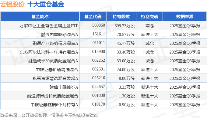 持有云铝股份最多的基金为万家中证工业有色金属主题ETF,目前规模为36.1亿元,最新净值1.4079(10月24日),较上一交易日上涨2.26%,近一年上涨8.75%。该基金现任基金经理为贺方舟。