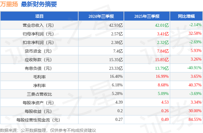 据证券之星公开数据整理,近期万里扬(002434)发布2025年三季报。截至本报告期末,公司营业总收入42.01亿元,同比下降2.14%,归母净利润3.41亿元,同比上升32.58%。按单季度数据看,第三季度营业总收入13.9亿元,同比下降10.65%,第三季度归母净利润6414.65万元,同比下降12.02%。本报告期万里扬公司应收账款体量较大,当期应收账款占最新年报归母净利润比达660.45%。