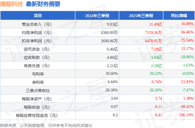 据证券之星公开数据整理,近期捷顺科技(002609)发布2025年三季报。截至本报告期末,公司营业总收入11.49亿元,同比上升16.88%,归母净利润7159.36万元,同比上升66.46%。按单季度数据看,第三季度营业总收入4.06亿元,同比上升9.35%,第三季度归母净利润3011.44万元,同比上升15.86%。本报告期捷顺科技公司应收账款体量较大,当期应收账款占最新年报归母净利润比达1256.58%。