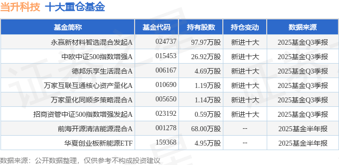 持有当升科技最多的基金为永赢新材料智选混合发起A,目前规模为0.72亿元,最新净值1.1579(10月24日),较上一交易日上涨4.13%。该基金现任基金经理为欧子辰。