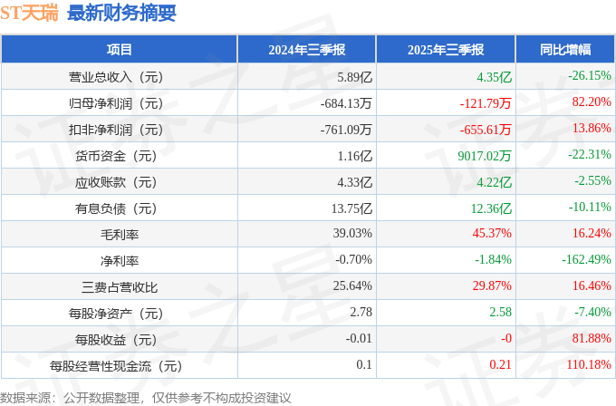 据证券之星公开数据整理,近期ST天瑞(300165)发布2025年三季报。截至本报告期末,公司营业总收入4.35亿元,同比下降26.15%,归母净利润-121.79万元,同比上升82.2%。按单季度数据看,第三季度营业总收入1.4亿元,同比下降33.03%,第三季度归母净利润836.6万元,同比上升3.95%。本报告期ST天瑞公司应收账款体量较大,当期应收账款占最新年报营业总收入比达49.6%。