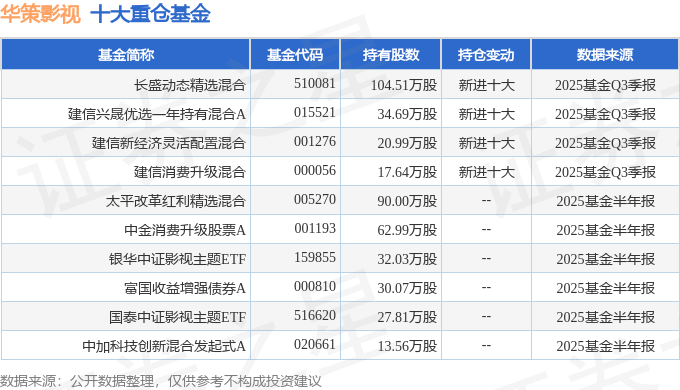 持有华策影视最多的基金为长盛动态精选混合,目前规模为2.65亿元,最新净值1.7484(10月24日),较上一交易日下跌0.22%,近一年上涨11.03%。该基金现任基金经理为郝征。