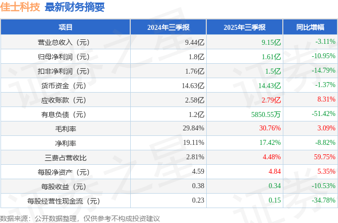 据证券之星公开数据整理,近期佳士科技(300193)发布2025年三季报。截至本报告期末,公司营业总收入9.15亿元,同比下降3.11%,归母净利润1.61亿元,同比下降10.95%。按单季度数据看,第三季度营业总收入3.1亿元,同比上升3.8%,第三季度归母净利润5430.71万元,同比上升14.44%。本报告期佳士科技公司应收账款体量较大,当期应收账款占最新年报归母净利润比达109.35%。