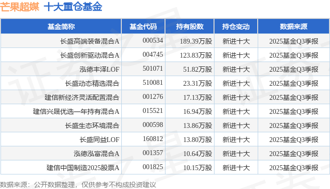 持有芒果超媒最多的基金为长盛高端装备混合A,目前规模为12.84亿元,最新净值4.643(10月24日),较上一交易日上涨3.09%,近一年上涨56.49%。该基金现任基金经理为王远鸿。