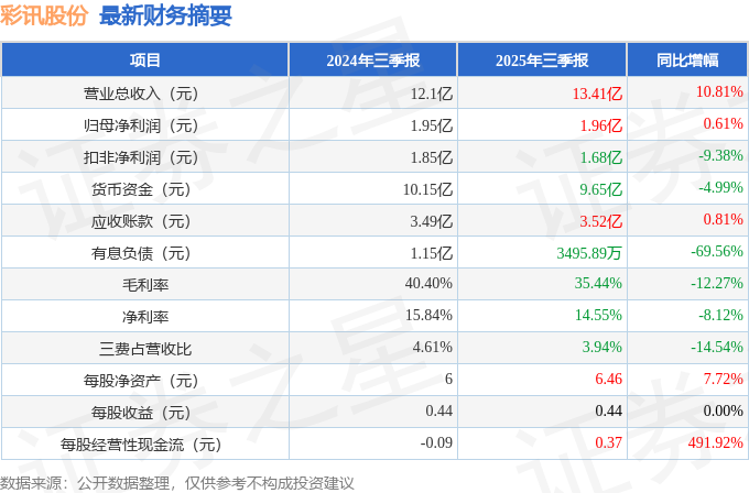 据证券之星公开数据整理,近期彩讯股份(300634)发布2025年三季报。截至本报告期末,公司营业总收入13.41亿元,同比上升10.81%,归母净利润1.96亿元,同比上升0.61%。按单季度数据看,第三季度营业总收入4.22亿元,同比下降1.76%,第三季度归母净利润6098.34万元,同比下降20.99%。本报告期彩讯股份公司应收账款体量较大,当期应收账款占最新年报归母净利润比达152.96%。