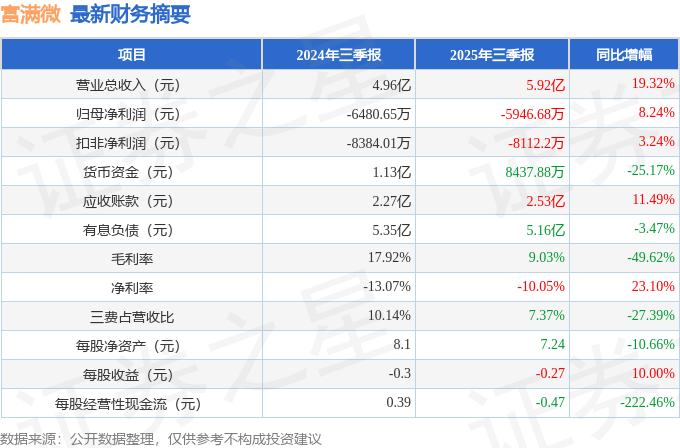 据证券之星公开数据整理,近期富满微(300671)发布2025年三季报。根据财报显示,富满微营收上升亏损收窄。截至本报告期末,公司营业总收入5.92亿元,同比上升19.32%,归母净利润-5946.68万元,同比上升8.24%。按单季度数据看,第三季度营业总收入2.09亿元,同比上升8.19%,第三季度归母净利润-2369.93万元,同比下降39.51%。