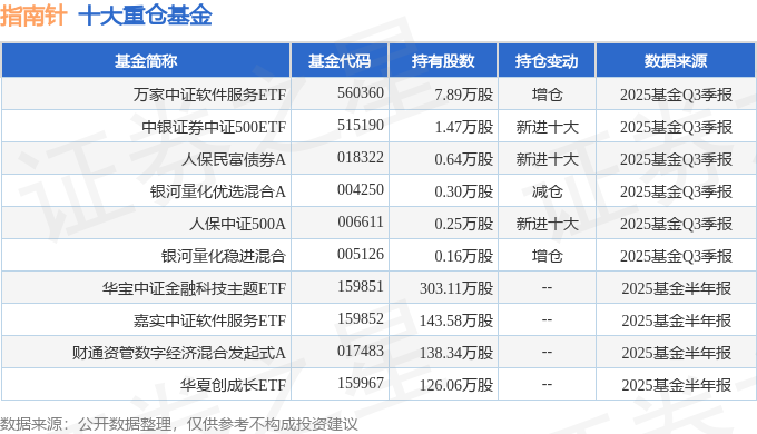 持有指南针最多的基金为万家中证软件服务ETF,目前规模为2.07亿元,最新净值1.5812(10月24日),较上一交易日上涨1.29%,近一年上涨48.71%。该基金现任基金经理为贺方舟。