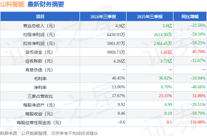 据证券之星公开数据整理,近期山科智能(300897)发布2025年三季报。截至本报告期末,公司营业总收入3.8亿元,同比下降22.56%,归母净利润2614.98万元,同比下降59.34%。按单季度数据看,第三季度营业总收入1.44亿元,同比下降9.1%,第三季度归母净利润473.67万元,同比下降79.26%。本报告期山科智能公司应收账款体量较大,当期应收账款占最新年报归母净利润比达457.24%。