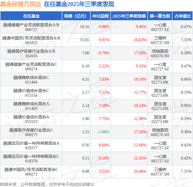 万民远管理的融通鑫新成长混合A基金在21年4季度买入一心堂,已连续持有4年又0个季度。持有期间的估算收益率为-49.6%,持有期间一心堂在2021年到2025年的中报营业总收入增幅达33.02%。