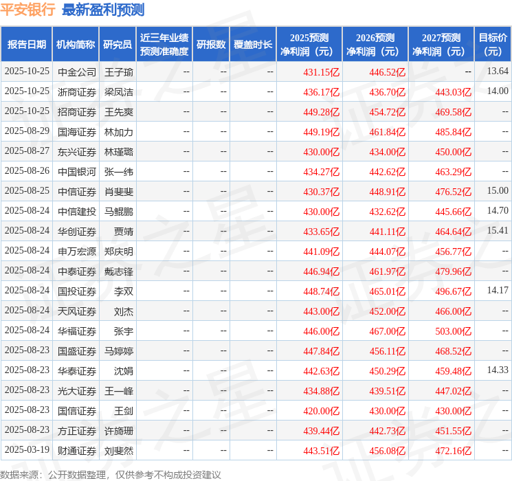 平安银行 2025 年前三 季度息差 企稳, 资产质量 稳健。 我们预 测公司2025-2027 年归母净利润同比增长为-3.09%、 +2.33%、 +2.70%,对应现价 BPS: 23.24、 24.93、 26.65 元。