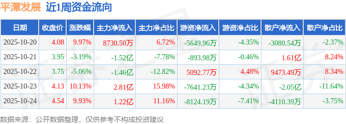 资金流向数据方面,本周平潭发展主力资金合计净流入1.93亿元,游资资金合计净流出1.72亿元,散户资金合计净流出2093.18万元。本周资金流向一览见下表: