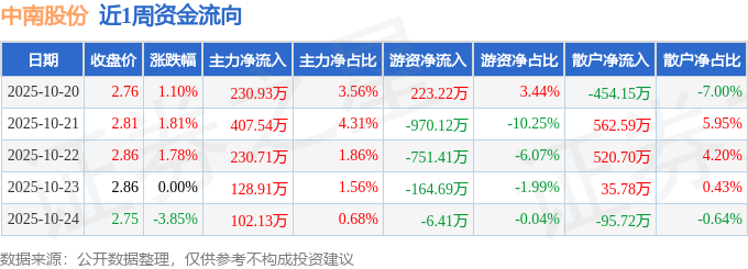 沪深股通持股方面,截止2025年10月24日收盘,中南股份深股通持股数为1395.11万股,占流通股比为58.0%。